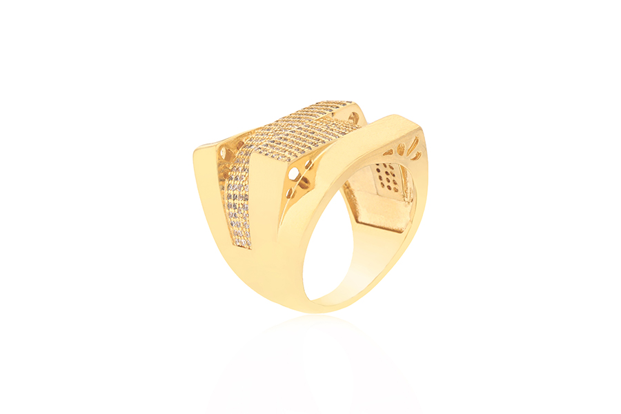 ANEL BANHADO EM OURO, APARADOR UNITÁRIO COM 4 FILEIRAS DE ZIRCÔNIAS E CANETA DE BANHADO EM RÓDIO BRANCO, 5mm LARGURA