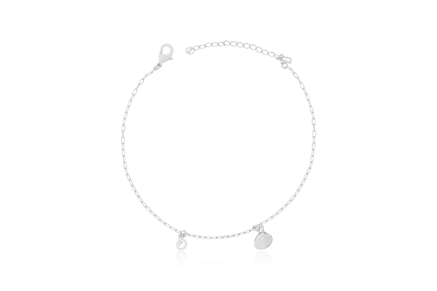 TORNOZELEIRA BANHADA EM PRATA LEVE, ELO CARTIER 3x1,50mm, 22cm COMPRIMENTO, EXTENSOR 5cm, CONCHA E PONTO DE LUZ