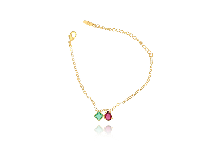 TORNOZELEIRA BANHADA EM OURO, ELO 2mm LARGURA, 22cm COMPRIMENTO, ZIRCÔNIAS QUADRADA E GOTA, COLORIDAS