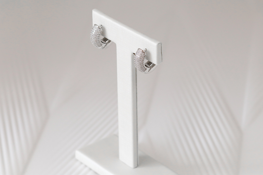 BRINCO BANHADO EM RÓDIO BRANCO, 13mm DIÂMETRO, 6,40mm LARGURA COM 7 ZIRCÔNIAS