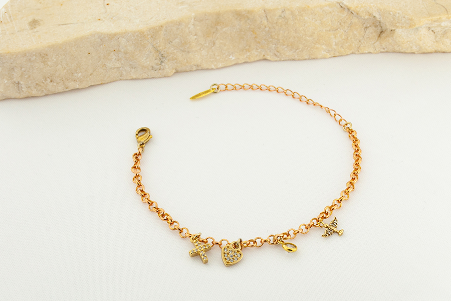 PULSEIRA BANHADA EM OURO, ELO PORTUGUÊS 3mm E 1,50mm, CORAÇÃO 7mm LARGURA, 17cm COMPRIMENTO