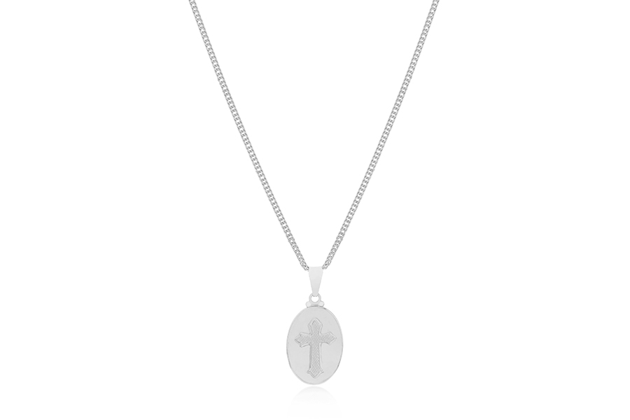 GARGANTILHA BANHADA EM PRATA LEVE, VENEZIANA 0,80mm, 40cm COMPRIMENTO, EXTENSOR 5cm COMPRIMENTO E CRUZ 3,60X2,20cm