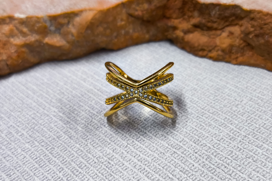 ANEL BANHADO EM OURO, 17mm LARGURA, COM 5 ZIRCÔNIAS
