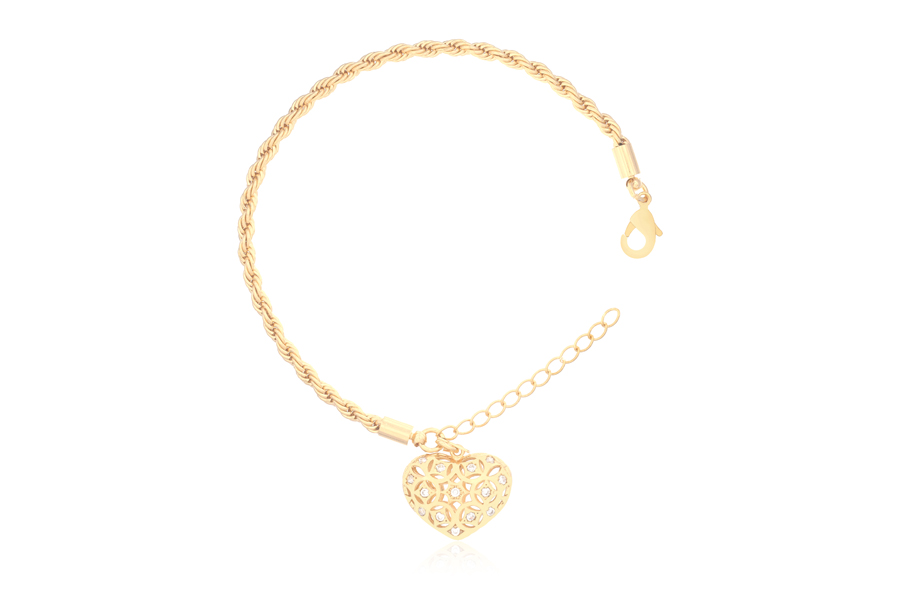 PULSEIRA BANHADA EM OURO, ELO PORTUGUÊS 3mm E 1,50mm, CORAÇÃO 7mm LARGURA, 17cm COMPRIMENTO