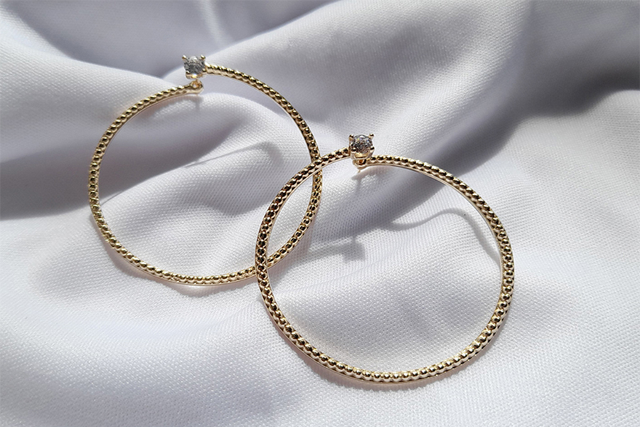 BRINCO BANHADO EM OURO, ARGOLA EM ESPIRAL CRAVEJADA NA PARTE INTERNA, 31mm DIÂMETRO E 13mm LARGURA