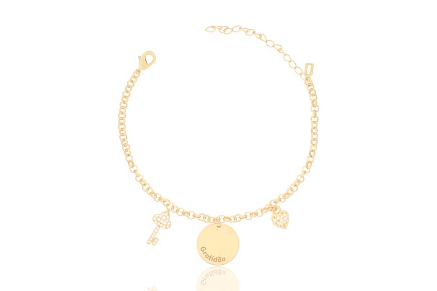 PULSEIRA BANHADA EM OURO, ELO PORTUGUÊS 3mm, ELO CORAÇÃO 4,20mm LARGURA, PINGENTE CORAÇÃO 11mm LARGURA COM MENINA