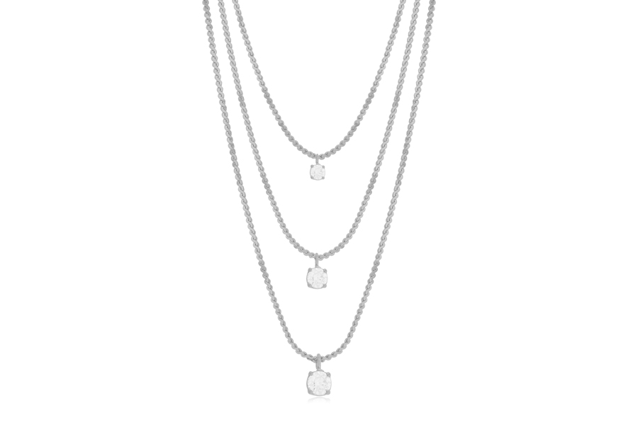 GARGANTILHA EM PRATA, 2 ZIRCÔNIAS GOTA E 3 PONTOS DE LUZ COM CRAVAÇÃO INGLESA, ELO CADEADO, 40+5cm COMPRIMENTO