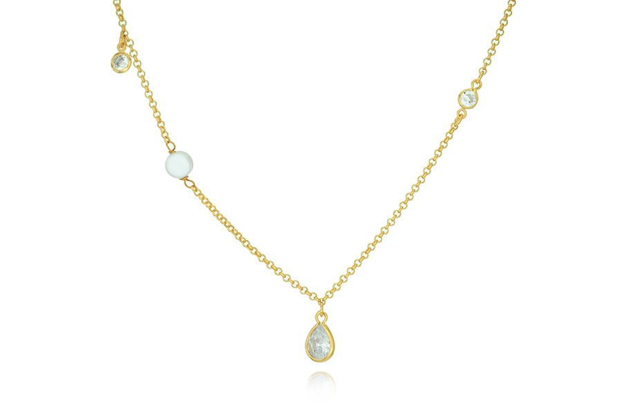 GARGANTILHA EM PRATA, 2 ZIRCÔNIAS GOTA E 3 PONTOS DE LUZ COM CRAVAÇÃO INGLESA, ELO CADEADO, 40+5cm COMPRIMENTO